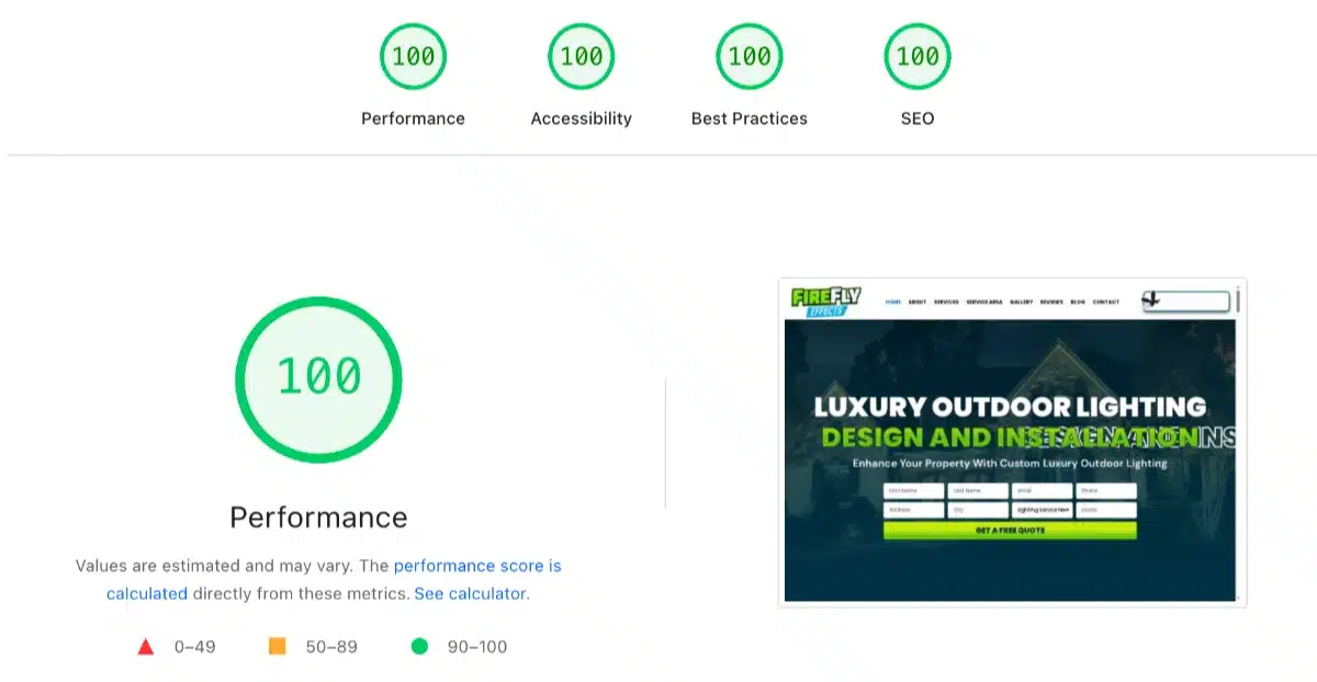 Behind the glow of the design is serious performance engineering. Even with visually rich galleries, bold imagery, and dynamic elements throughout the site, we optimized every layer to ensure exceptional speed and structure. Firefly Effects achieved perfect 100 scores across the board in Google PageSpeed Insights for desktop, including performance, accessibility, SEO, and best practices. That means the site doesn’t just look polished, it runs flawlessly. Every asset was compressed intentionally, every script was handled carefully, and every layout decision was made with both beauty and speed in mind. It’s proof that a visually stunning website can still be technically elite when it’s built with precision from the ground up.