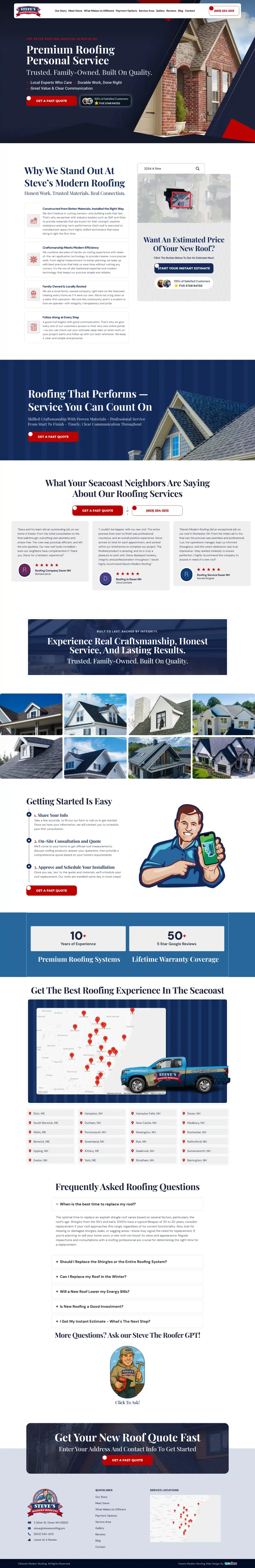 For Steve’s Modern Roofing, we built a website that matches the craftsmanship and integrity on which owner Stephen Payne has built his reputation. We created a polished, mobile-friendly platform that highlights their premium roofing services across the New Hampshire Seacoast, making it simple for homeowners to learn about their process, browse past work, and request quotes online. The design strikes a balance between modern aesthetics and trust-building features, including customer reviews, service breakdowns, and a clean, easy-to-navigate layout. Much like a well-installed roof, this website was built to last, helping Steve’s Modern Roofing stand out against competitors, attract more leads, and give potential customers confidence from the very first click. At 180 Sites, we don’t just build websites, we raise the roof on your digital presence and give your business the strength to weather any online challenge.
