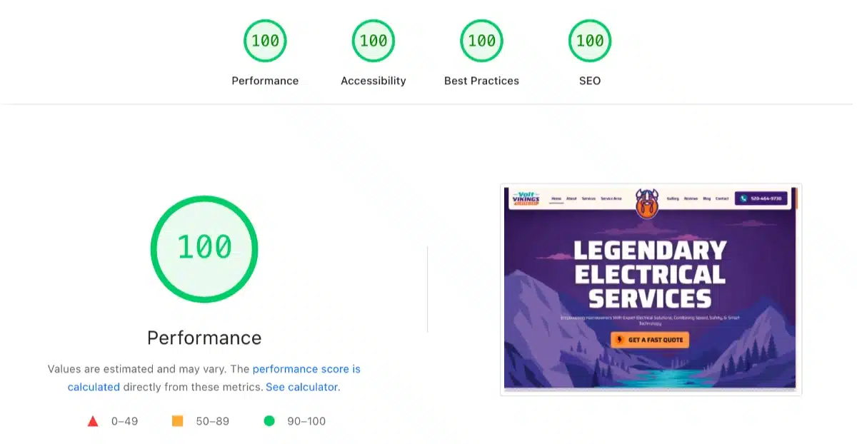 What makes this project even more satisfying is what’s happening under the hood. Despite the bold visuals and immersive design, we engineered the Volt Vikings site to be lightning fast, earning 100 scores across the board in Google PageSpeed Insights for speed, accessibility, SEO, and best practices. Every image, script, and layout decision was intentional, balancing visual impact with technical precision so nothing slows the experience down. It’s proof that a website doesn’t have to choose between looking impressive and performing flawlessly; you can have both when it’s built the right way.